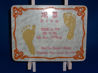 | 手形・足型 (原寸で加工するので正確なサイズ) | 生まれたばかりの赤ちゃんの手形・足形を彫りこんだ大理石 一生の記念だから高級感ある大理石に生年月日 身長・体重・パパ・ママのメッセージも一緒に刻みます。 手形なども原寸で入りますのでお子様が大きくなった時の 反応が楽しみですね。 |